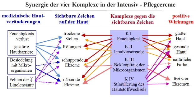 * Marleen Intensiv - Pflegecreme arbeitet mit vier Wirkkomplexen (s.Abb.). Jeder enthält mehrere Wirkstoffe.